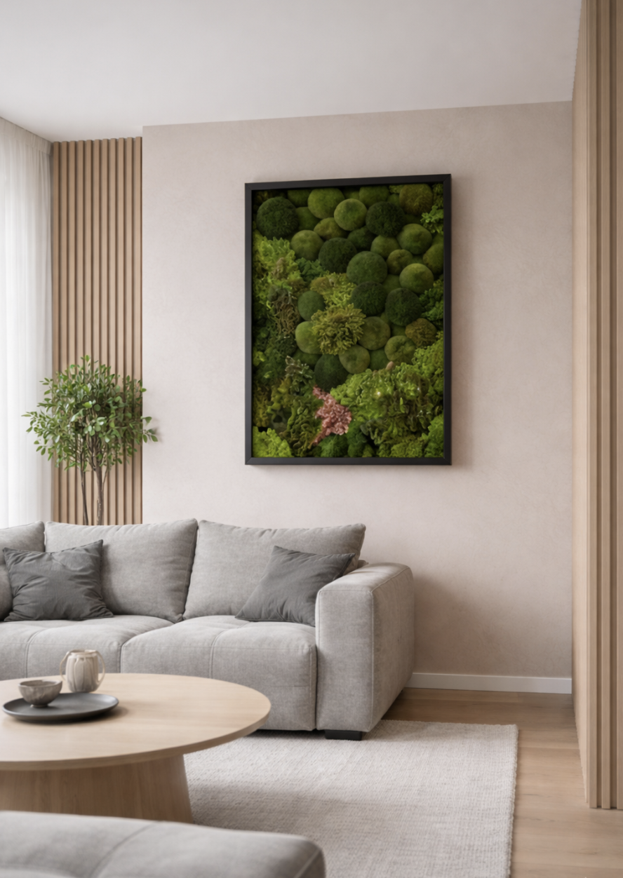 To je důvod, proč jsou mechové obrazy v posledních letech tak populární – jak v domácnostech, tak v kavárnách, kancelářích nebo studiích. Přinášejí klid a přírodní estetiku i tam, kde živé rostliny prostě nefungují.